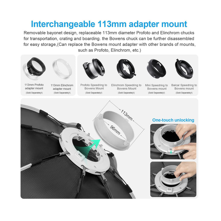 The softbox includes an interchangeable speed ring with a quick-release mechanism, supporting mounts with a 113mm diameter. This allows for compatibility with other popular mounts, such as Elinchrom and Profoto (sold separately).