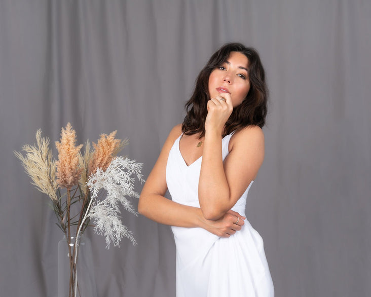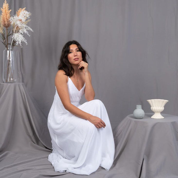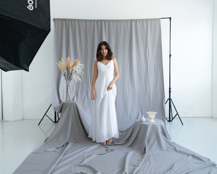 The 'Clean Slate Grey' Muslin backdrop adds a touch of drama and depth and will work within a vast range of shooting conditions. It is the perfect backdrop for both natural and studio lighting. For a lighter look check out Waterfall Grey!