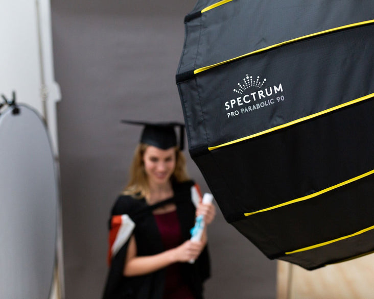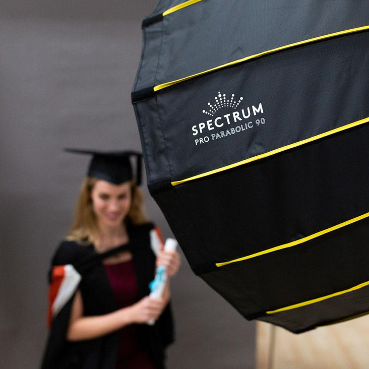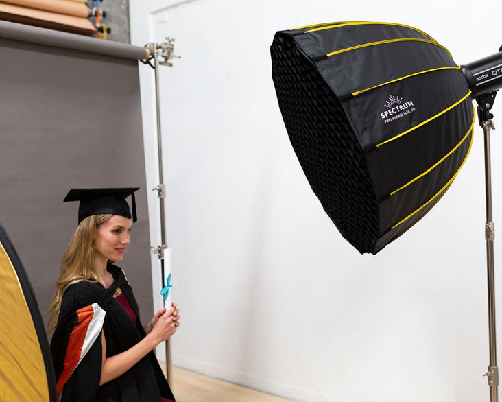 The reflective silver lining on the interior of the softbox and the deep design helps control and funnel the lighting to maximise the effect. The shape and reflective nature of the Parabolic softbox yield beautiful catchlights perfect for portrait and fashion photography. The softbox also includes a grid to achieve an even more direct light that can help reduce the spread of light and get a more focused beam angle. The possibilities are endless with the Spectrum Pro Parabolic softbox.