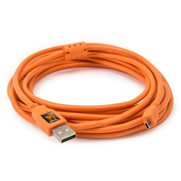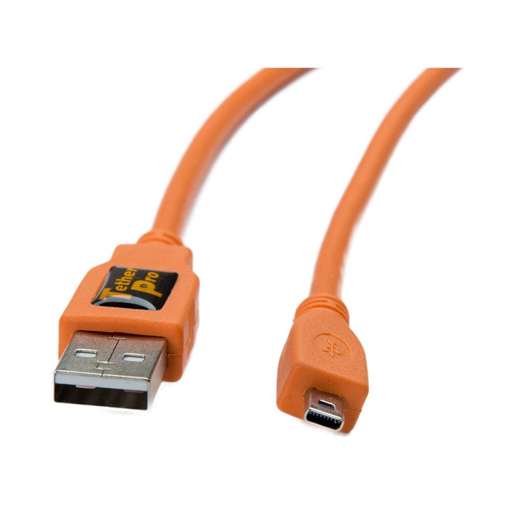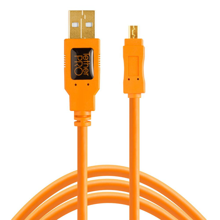 The TetherPro cable connects to a camera using a Mini-B 8 Pin port. This cable is designed and manufactured to the highest USB specifications ensuring delivery of excellent performance in speed and reliability. Available in High-Visibility Orange or Black.