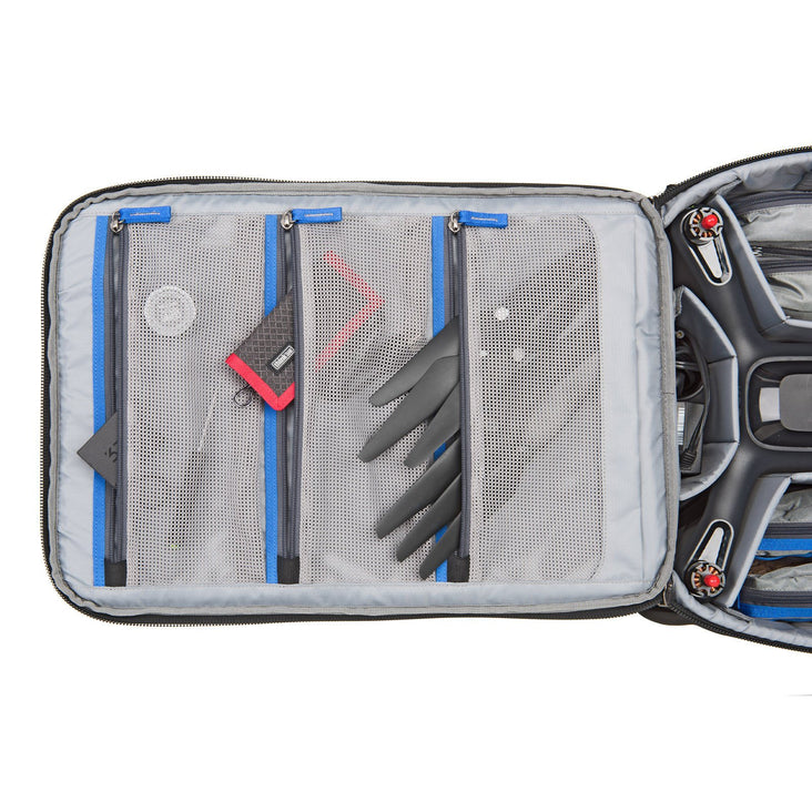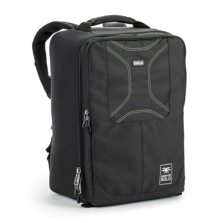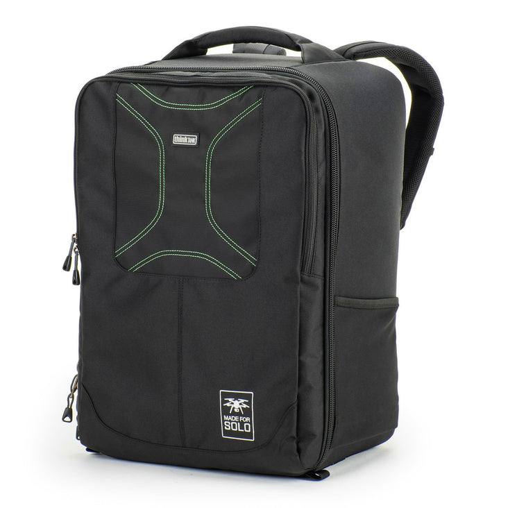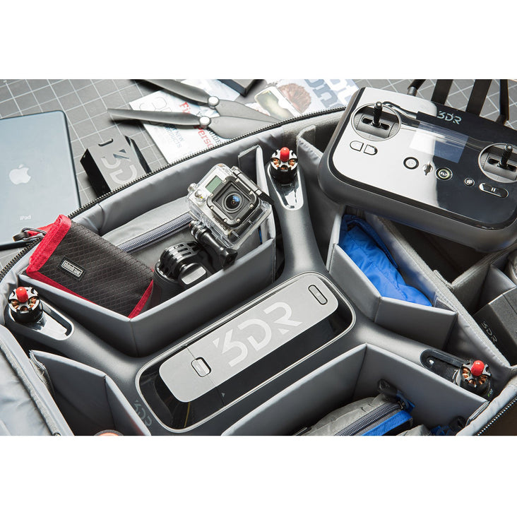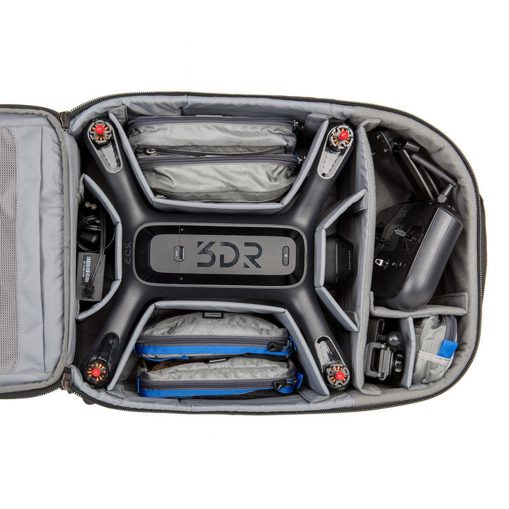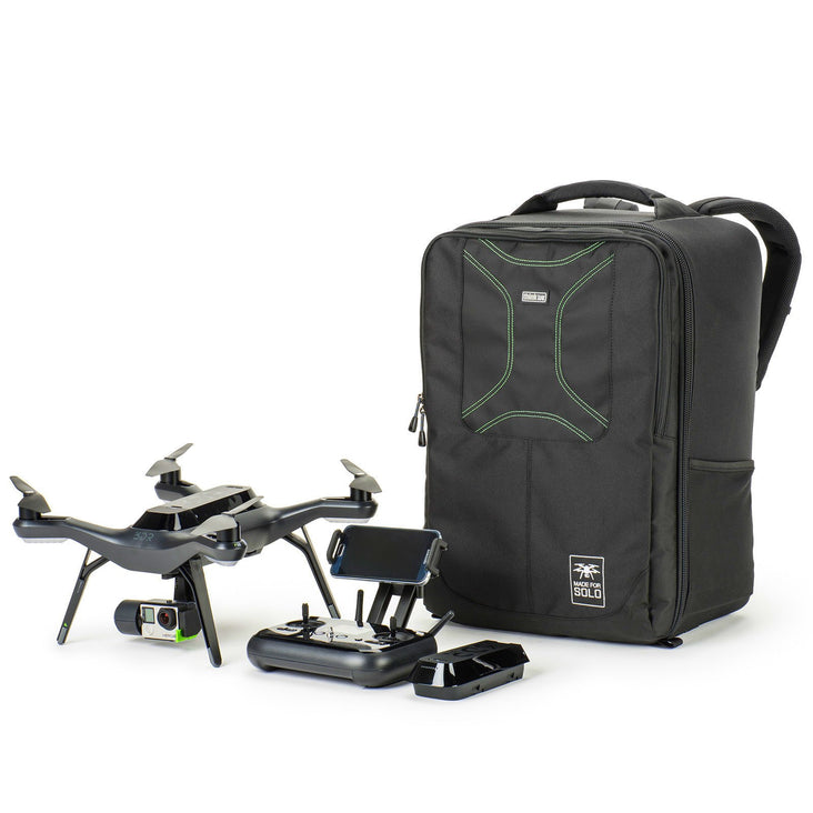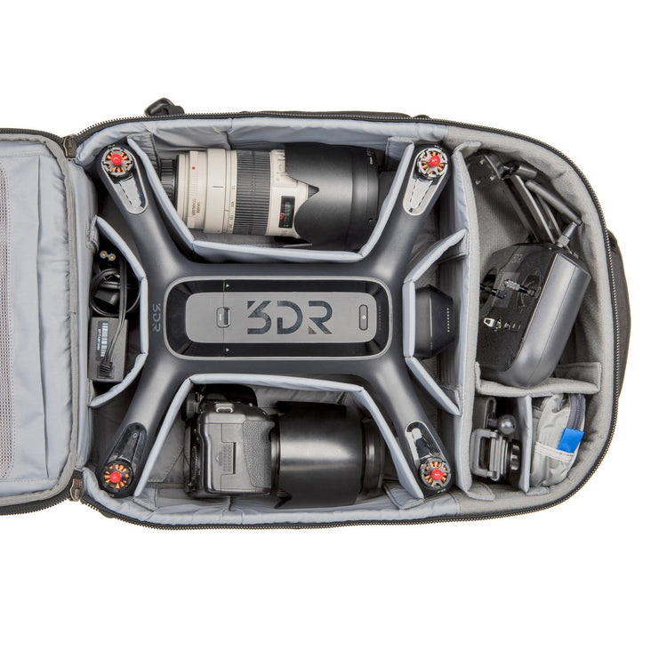A full-featured backpack designed specifically for carrying a 3DR Solo + 15" laptop, controller, GoPros, charger, spare rotors, extra batteries