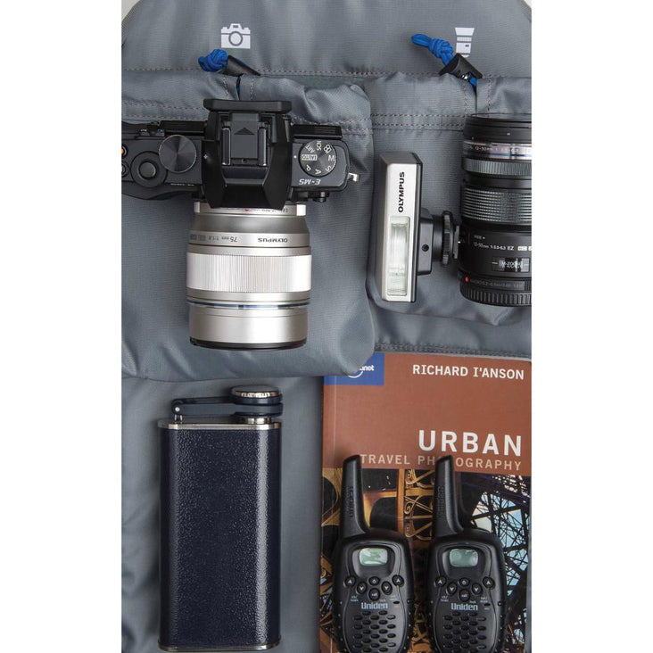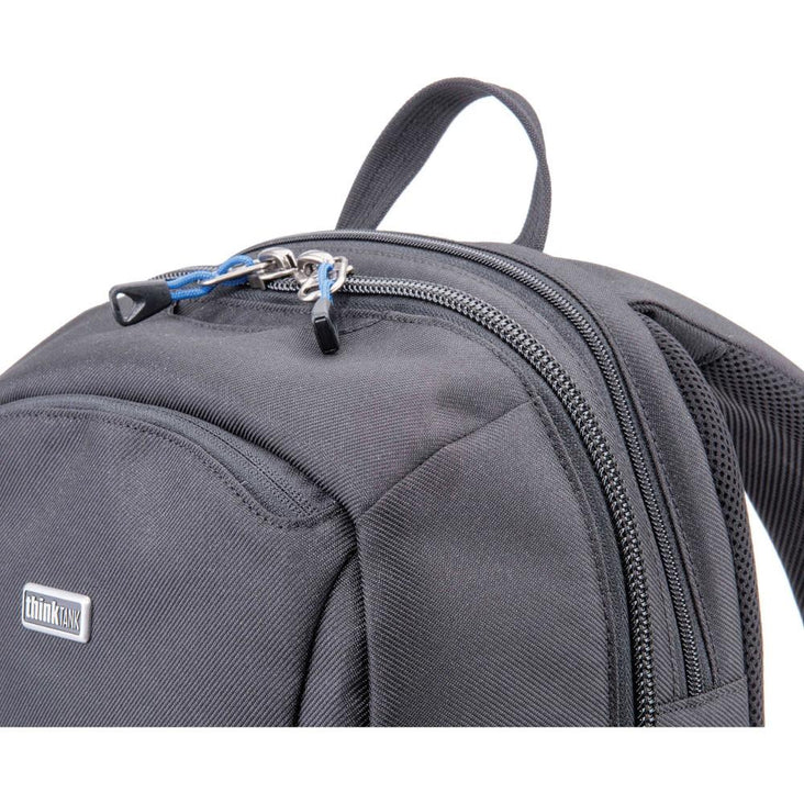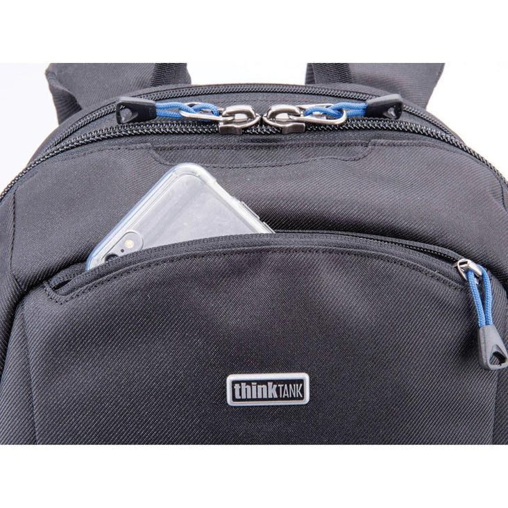 Think Tank Photo designed their black Perception 15 Backpack as a day pack that gives you maximum mobility without sacrificing carrying capacity. This versatile bag has a padded and divided compartment accommodates laptops up to 15" plus tablets up to 10". The main compartment can hold a mirrorless camera body or a small DLSR with a small to medium zoom lens attached with the lens hood reversed, plus 1-2 additional lenses or a medium GoPro/action cam kit.