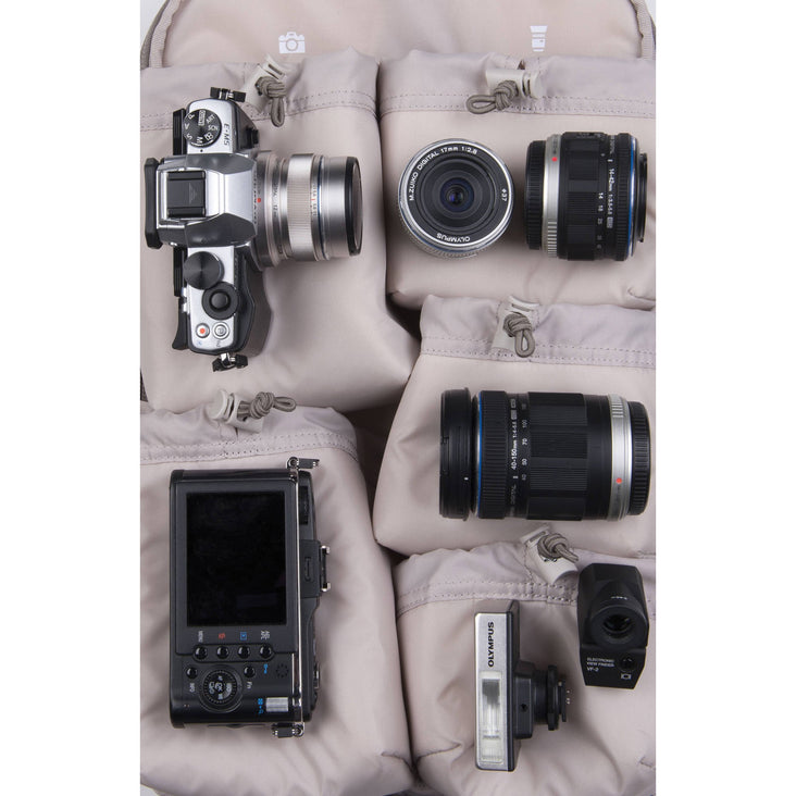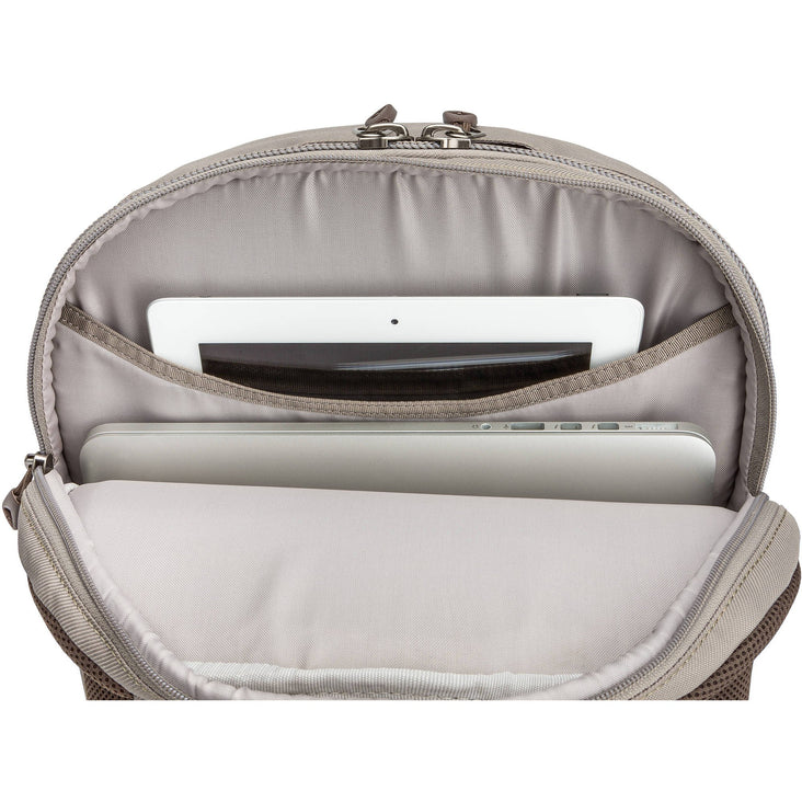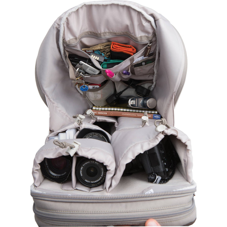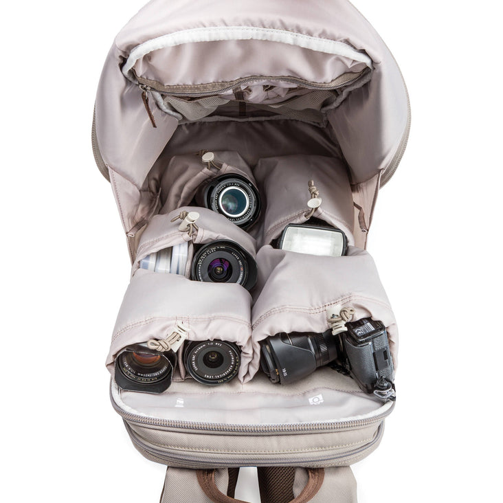 Think Tank Photo designed their taupe Perception Pro Backpack as a daypack that gives you maximum mobility without sacrificing carrying capacity. This versatile bag has a padded and divided compartment accommodates laptops up to 15" plus tablets up to 10". The main compartment can hold a mirrorless camera body or a small DLSR with a small to medium zoom lens attached with the lens hood reversed, plus 4-5 additional lenses or a large GoPro/action cam kit.