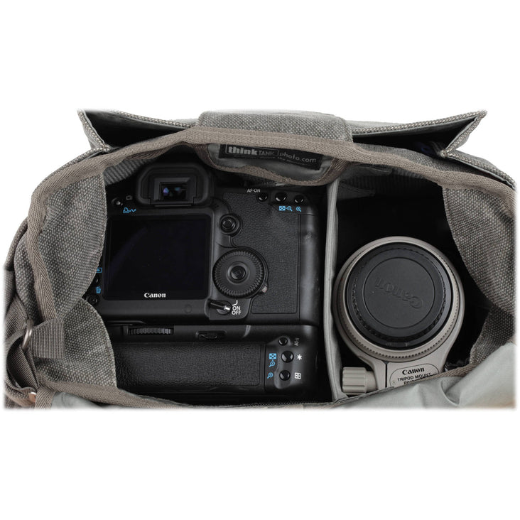 The pinestone gray Retrospective 20 Shoulder Bag from Think Tank is a small, discreet and simple bag designed for the photographer who carries a system such as one pro DSLR with a 70-200mm f/2.8 zoom attached to the camera. Or, it can hold a pro DSLR in the front pocket and 2-4 lenses in the main compartment. The interior dividers are customizable to accommodate the gear you carry on any given day.