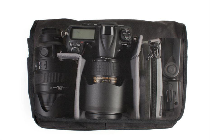 Outside, there is a large expandable pocket for a regular size DSLR body. The back of bag has a wide storage pocket that is made to hold collateral material like paperwork, maps or a note pad. Additional webbing loops are found outside to hold some small Modular, Skin or Multimedia pouches. Or, you can attach a carabiner to it for quick access items like keys. Two side pockets will hold small water bottles or even some small shoe-mount strobe lights. You have a business card holder Under the main flap.