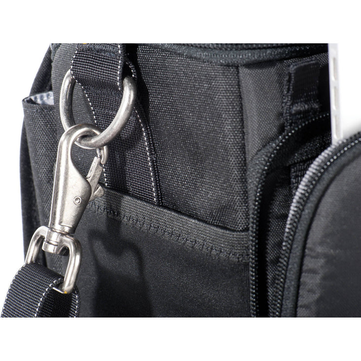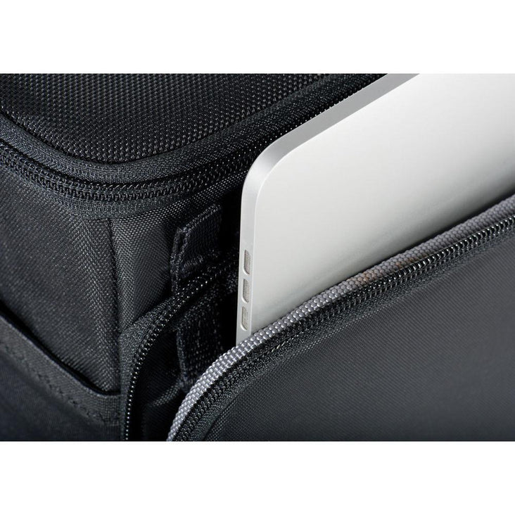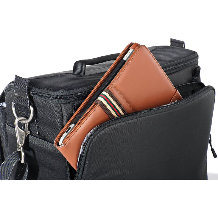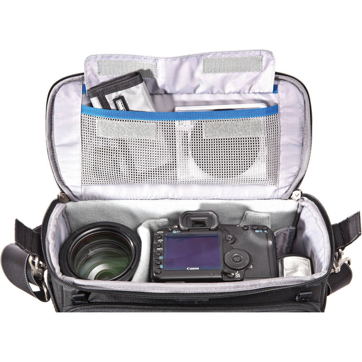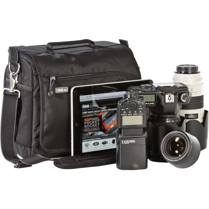 The black Sub Urban Disguise 30 Shoulder Bag from Think Tank features a compact design to hold your DSLR with 2 or 4 standard zooms, flash and other small items. It holds a 24-70mm f/2.8 attached to your camera and 70-200mm f/2.8 detached. There's also a dedicated padded slot for your iPad or tablet.