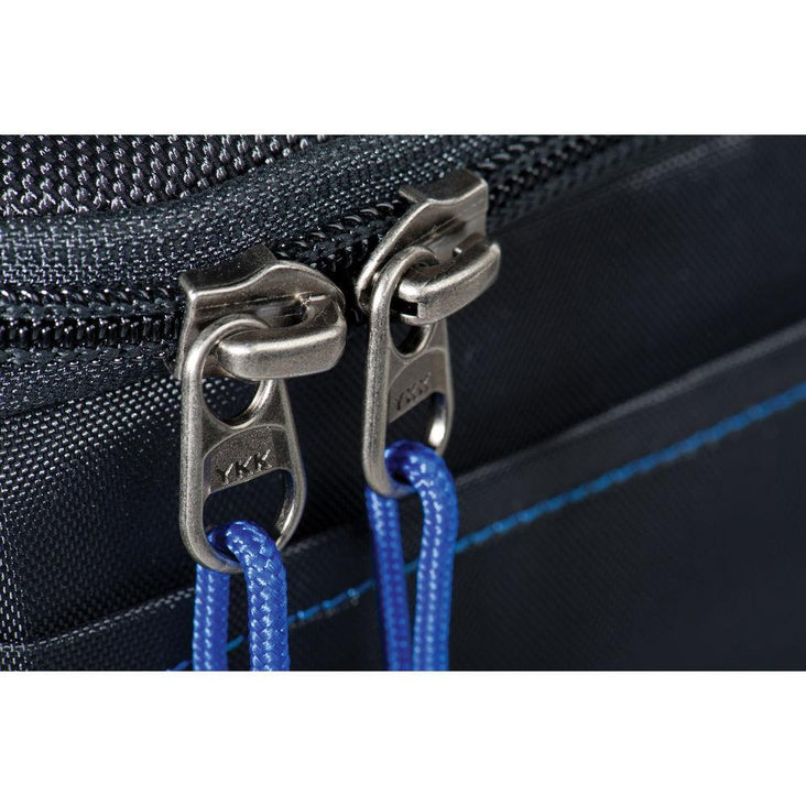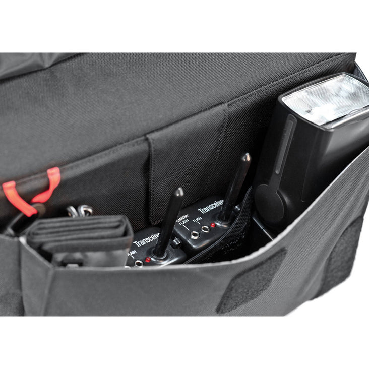 Front organizer pouch on front flap has enough room for a cell phone, memory cards, pens and other items