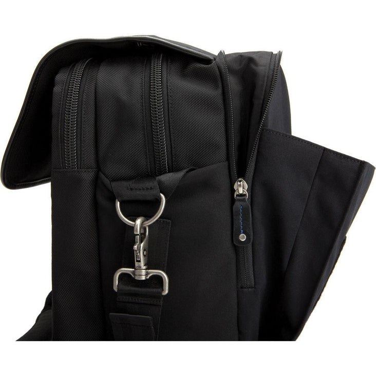 - Front pocket organizer provides quick access to pens, business cards, and keys