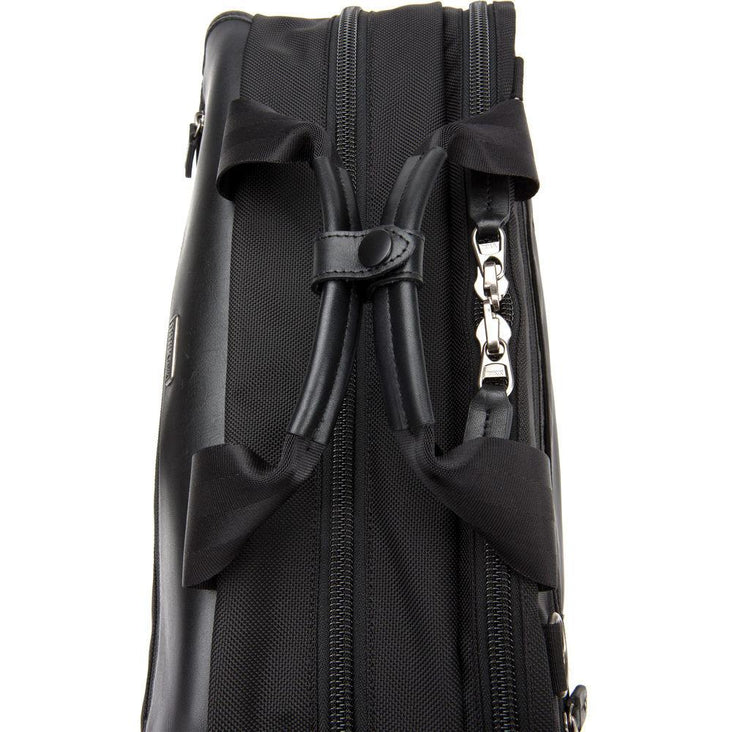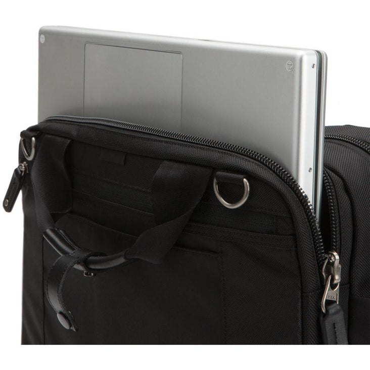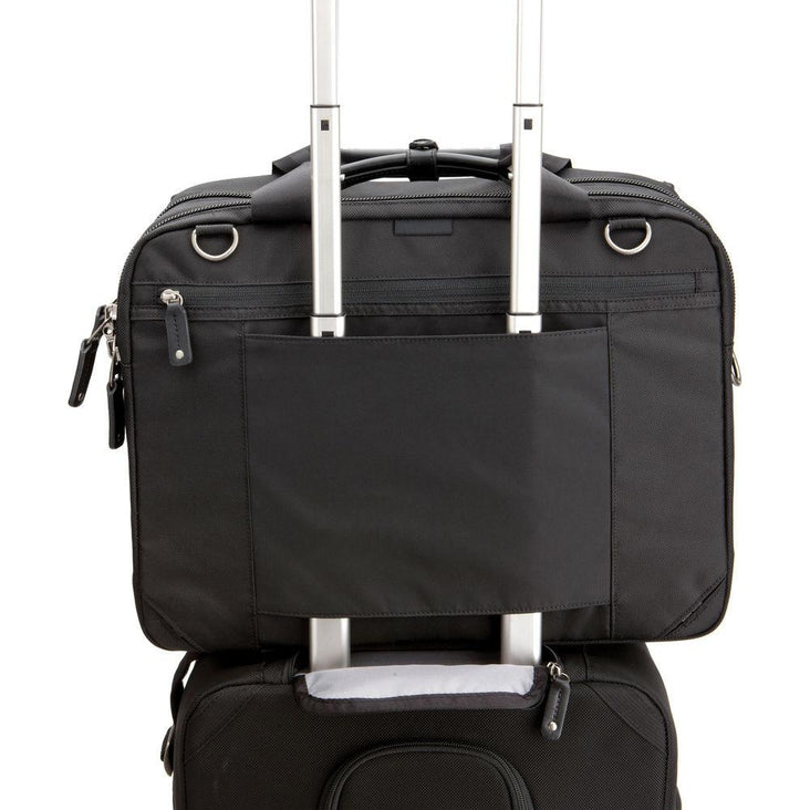 - Wide roller handle pass-through secures your bag on the handle of a rolling suitcase