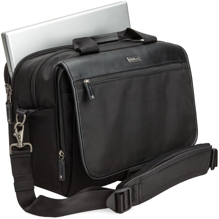 The ThinkTANK Urban Disguise 40 CLASSIC - Black is a camera shoulder bag that is designed to be stylish while being a fully functional option for the traveling photographer. This bag is crafted with genuine leather accents and panels, which contribute to a tasteful look that evokes the appearance of a well-designed briefcase.