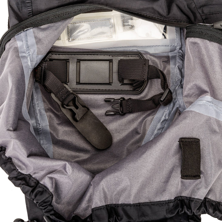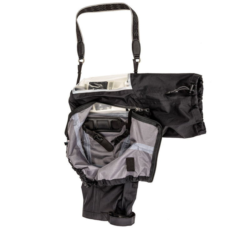 The lens strap inside the Hydrophobia allows the external Camera Strap to fully support the weight of the camera and lens. Tighten the lens strap then clip it around the back end of the lens, ensuring a snug fit.
