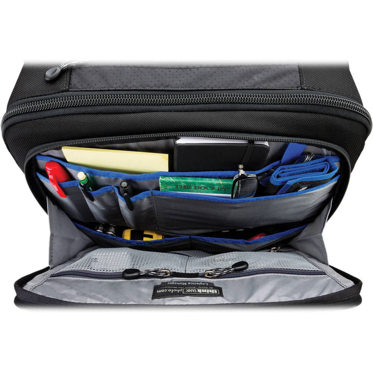 This case represents an enhancement of the previous Think Tank Logistics Manager. Some of the improvements include lockable zipper sliders, a stiffer lid to protect the contents, zippered side pocket for the included cable and lock. In addition, the serial number ID plate is now molded plastic. The lid straps are now longer to provide more choice of angles when the case is opened. Mesh interior pockets replaced the older polyurethane windows and the overall weight of the case has been reduced by 15%.