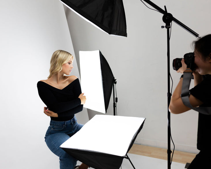 The Triple "Illuminate Mate" Rectangle Softbox Boom Arm Lighting Kit is the perfect three point lighting set up. This kit is ideal for taking product catalogue photos, fashion lookbook, glamour shots and all around perfect for taking professional photos and videos. The kit includes a boom arm, perfect for hairline lighting and achieving the perfect three point lighting set up to give your photos even and consistent lighting.