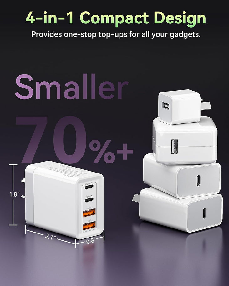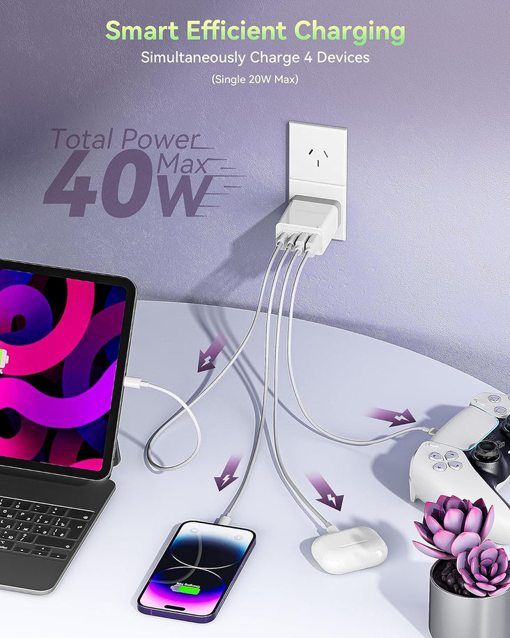 - Features 2 USB-A ports (15W Max) and 2 USB-C ports (20W Max) for simultaneous charging of multiple devices.