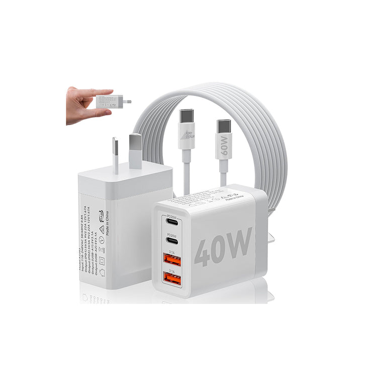 Introducing our 40W Dual USB-C Wall Charger – a powerful and versatile charging solution. This charger features a 4-Port 20W USB C Power Adapter with QC3.0 AUS Plug and comes with a Dual PD USBC Charger and C to C Fast Charging Cable. Compatible with iPhone 14/13/12, iPad, and Samsung devices, it ensures efficient and fast charging for your essential electronics. Upgrade your charging experience with our reliable and high-performance USB C Fast Charger.