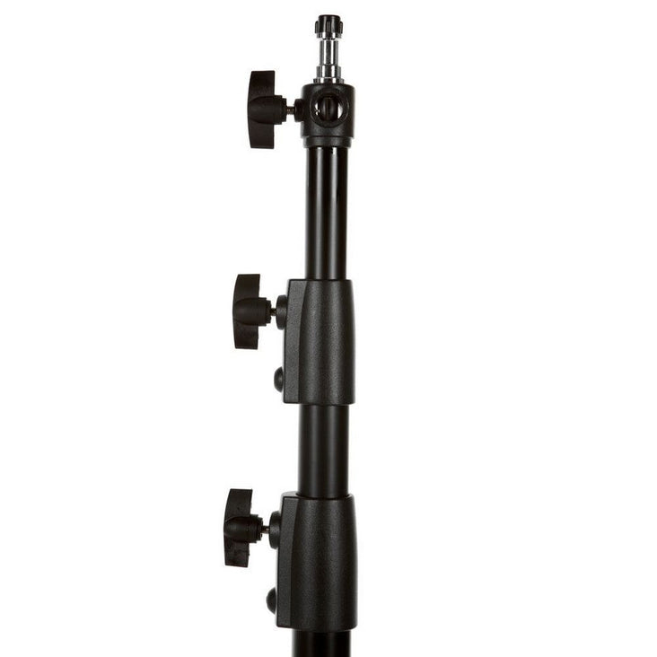 This professional quality light stand offers maximum support with minimum bulk. It is made of attractive black aluminum, making it lightweight and easy to take on location. It has a reversible spigot